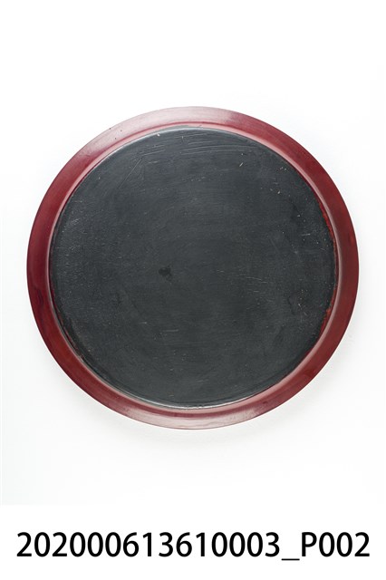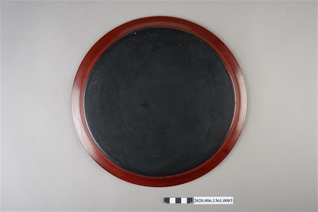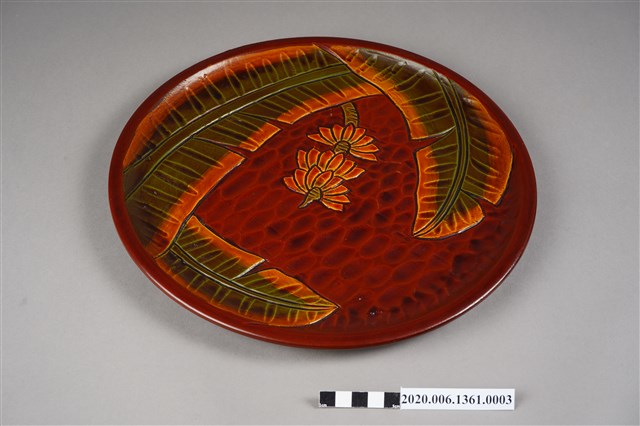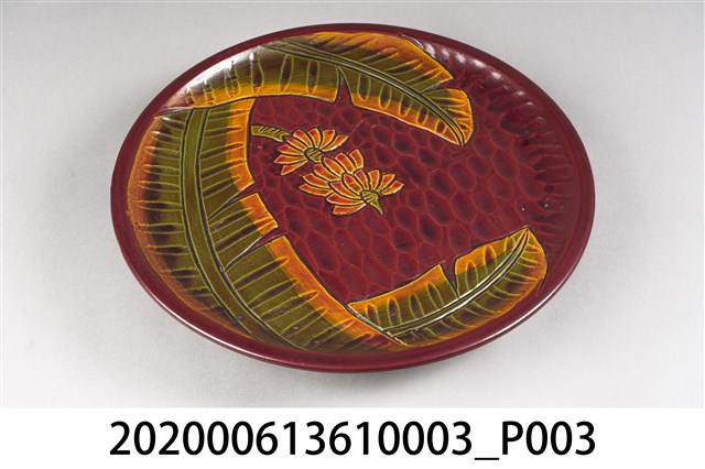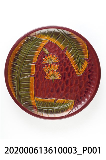 本件為香蕉樹漆器圓盤組,本件尺寸高1.4公分、直徑29公分。該組文物共計一組8件。圓盤以深紅色為底色,並有水波紋路,每一件皆繪有即將成熟的香蕉與香蕉樹(葉)。