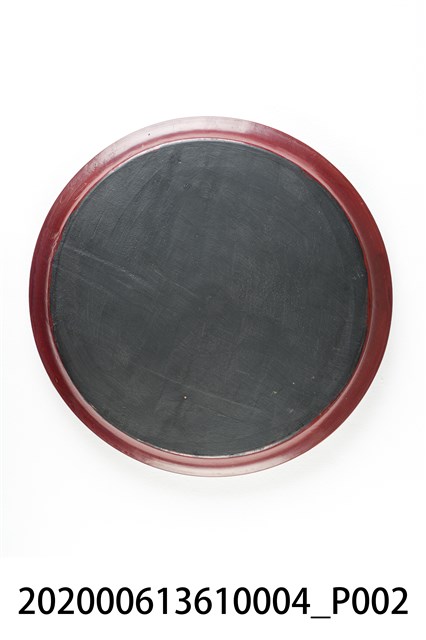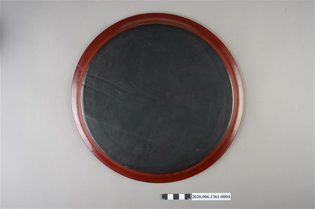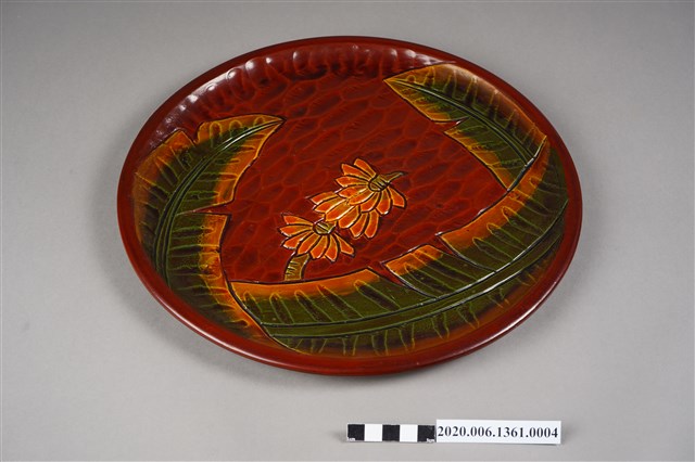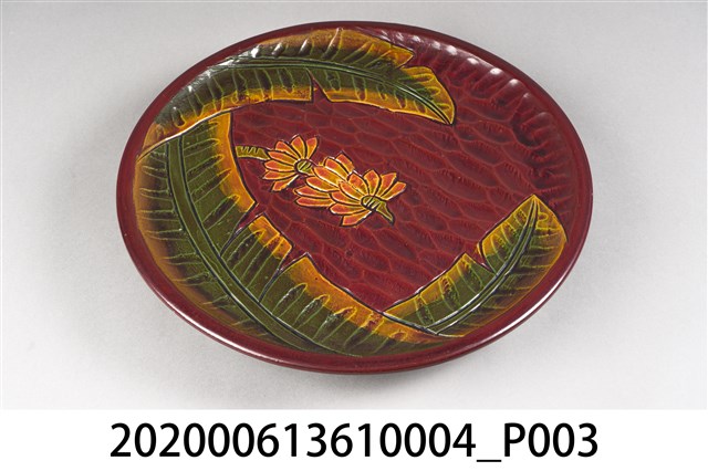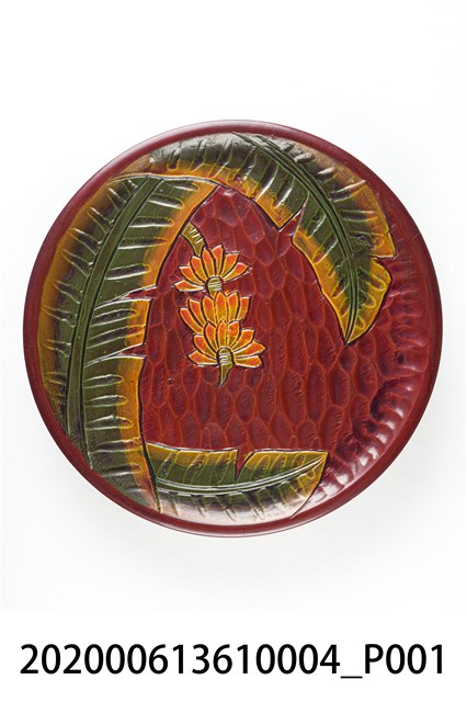 本件為香蕉樹漆器圓盤組,本件尺寸高1.4公分、直徑29公分。該組文物共計一組8件。圓盤以深紅色為底色,並有水波紋路,每一件皆繪有即將成熟的香蕉與香蕉樹(葉)。