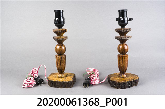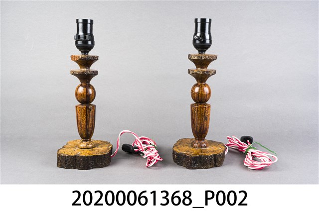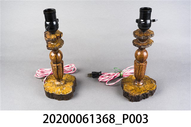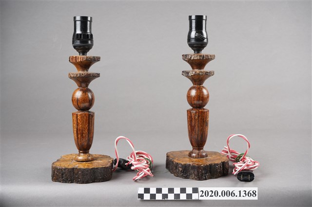 1.本件為菊花木燈座,本件尺寸長12公分、寬10.5公分、高28公分。整體顏色呈現帶有木質紋路的深咖啡色。根據原件反光程度,製作時應有塗上透明保護漆,致使反光。本件一組兩件(一對),皆有紅白電線與兩孔插頭,上方外觀為黑色、內側為金屬螺旋狀處,應為放置電燈泡之處。 2.菊花木,中文別名龍鬚藤、九龍藤等,通常分布在臺灣中、低海拔山區的森林。可作為中藥使用,有祛風濕、行氣血之效,治跌打損傷等作用。因菊花木因其莖之橫斷面呈現菊花紋,故得名。也因莖橫斷面具有菊花紋,使得其木材在工藝上頗富利用價值,而其木材則可供製器具之用。
