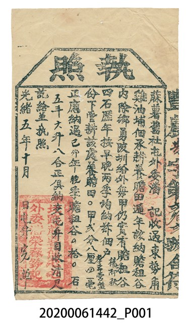 麻薯舊社屯外委潘記收過東勢角雞油埔佃承耕,加蓋"北路麻薯舊社屯外委之潘榮春金今記"