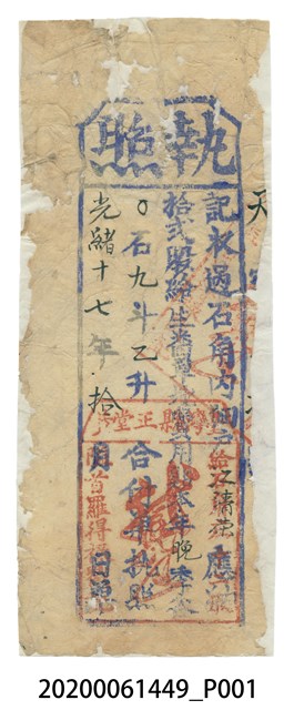記收過石角內佃戶江清榮應納12股給生番草地費貼本年晚季.臺灣縣正堂.隘首羅得祥