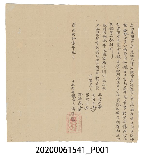 隘首潘清龍向 鍾宗貴首內生過佛銀10大員,紅印南路理番分府道光21年給老埤庒隘首長形戳記