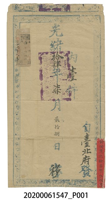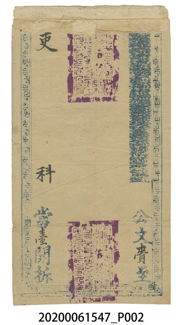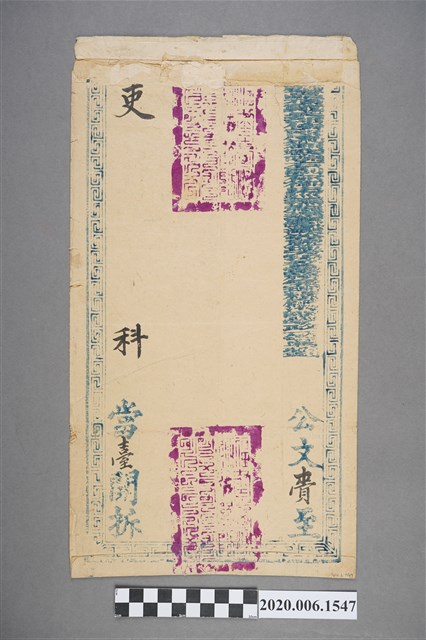 1.臺北府發吏科公文封套,為雙面直式形制,封口朝上,正反兩面皆有藍墨回字紋外框裝飾。正面回字紋框內有藍墨印刷光緒年月日,藍墨標示發文來源、和信封內文件數量等格式,並以墨書補書具體發文者、時間和件數,全文標示為:「光緒十四年柒月貳拾捌日移」(1888年)、「內壹件」、「自臺北府發」。右下角有一張紅色紙箋,紙箋上寫「發候選巡檢吳賀江領賫」。背面中間上下兩端都有紫紅色大印,右側邊緣有一行難以辨識的藍墨印刷,右下角有印寫「公文賫至」,左側邊緣印寫「吏科當臺開拆」。