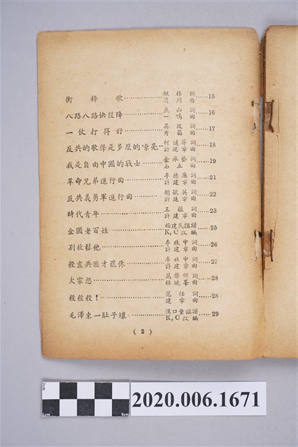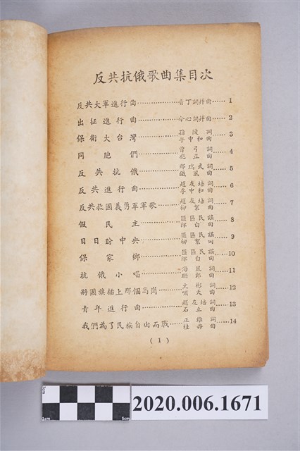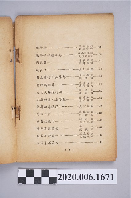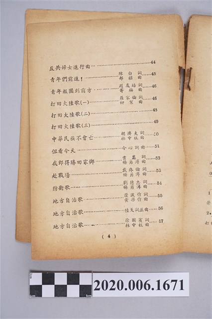 臺灣省新聞處編印. 共57首歌,內容31頁。隨書附「地方自治歌」歌譜,及反共救國漫畫展腰邀請函一份