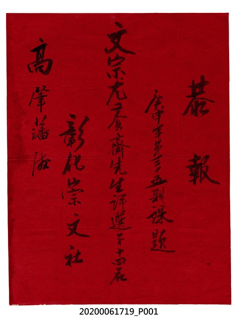 彰化崇文社文榜布告,整一冊另附單頁公告11張。 第13期課題.附有一「高肇藩」名片(地址台灣台北市大稻埕日新街南市壹丁目十二番戶)。外夾附3張寫上「恭報」的紅紙公告。