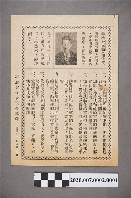 2020.007.0002 臺灣省保安司令部印〈逃匪林元枝〉傳單