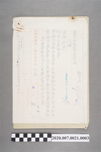 內可分兩批資料:1.「暴動」(二二八事件)資料集,共46頁;2.臺灣省專賣局火柴有限公司公文,共38頁。主要為火柴公司調查228事件期間損失調查、撫卹、工廠守護與槍枝調度等文件資料。