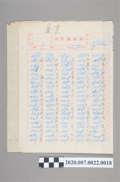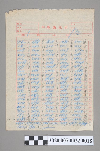 內容共有263張,為228事件其間中央通訊社記者發電南京總社的電文稿內容,為手稿、鉛筆稿等文件,內容相當零碎。本批文件主要內容於1992 年2 月經林德龍輯註、自立晚報社發行為《二二八官方機密史料》一書,為當時相當具震撼性的一手出土資料。除電文資料外,還有「介紹台灣」等專文書稿,1947年3月4日《中華日報》台北號外。