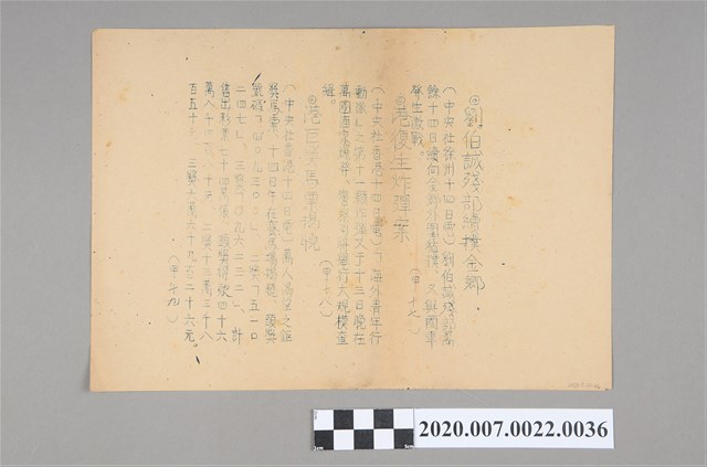 內容共有263張,為228事件其間中央通訊社記者發電南京總社的電文稿內容,為手稿、鉛筆稿等文件,內容相當零碎。本批文件主要內容於1992 年2 月經林德龍輯註、自立晚報社發行為《二二八官方機密史料》一書,為當時相當具震撼性的一手出土資料。除電文資料外,還有「介紹台灣」等專文書稿,1947年3月4日《中華日報》台北號外。