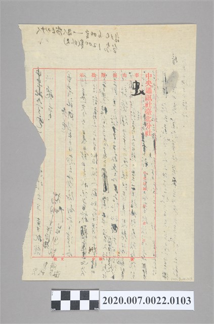 內容共有263張,為228事件其間中央通訊社記者發電南京總社的電文稿內容,為手稿、鉛筆稿等文件,內容相當零碎。本批文件主要內容於1992 年2 月經林德龍輯註、自立晚報社發行為《二二八官方機密史料》一書,為當時相當具震撼性的一手出土資料。除電文資料外,還有「介紹台灣」等專文書稿,1947年3月4日《中華日報》台北號外。
