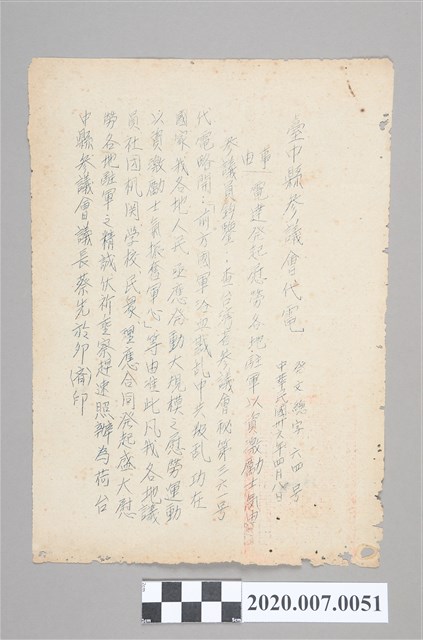 2020.007.0051 臺中縣參議會發起參議員舉辦勞軍活動電文