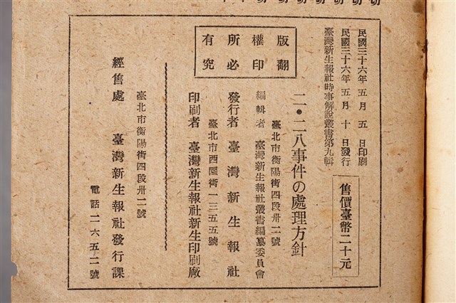 台灣新生報社編撰出版《二二八事件の處理方針》出版品,列為「日文時事解說叢書」第九冊,1947年5月發行,為日文小冊子,包括省戒嚴布告、國防部布告、白崇禧部長巡視等,還有針對青年、學生的專文。內容顯然是官方立場的出版品,以日文撰寫,對臺灣普遍識日文的青年學生進行宣傳。