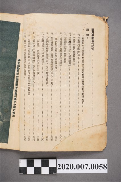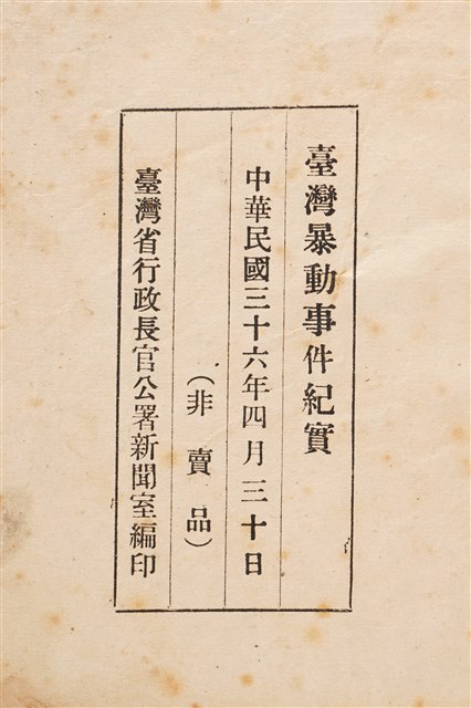 1947年4月出版,為省長官公署公定版的228事件說明宣傳出版品,除官方的228事件始末紀錄外,附有多項事件期間民間的公告文書等資料。