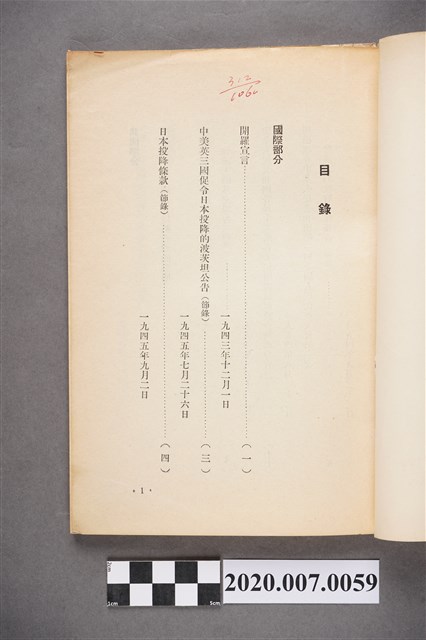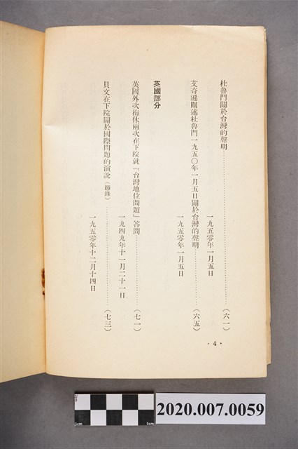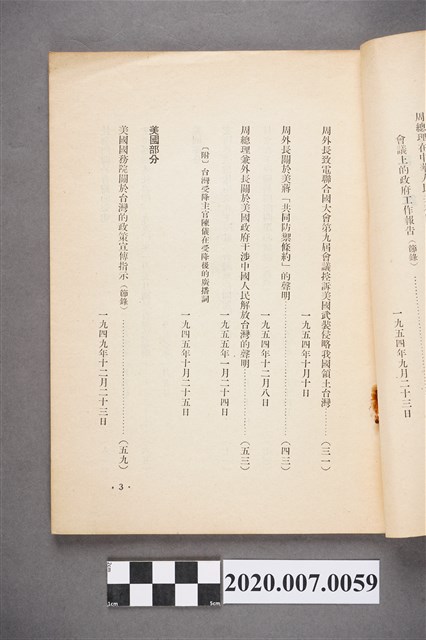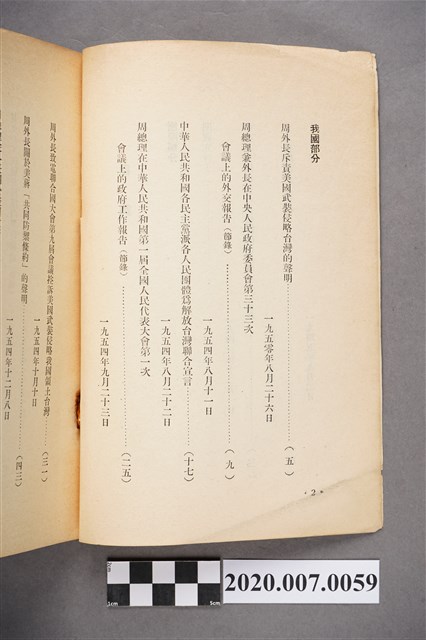 「中國人民外交學」會編印,封面蓋有「中華全國體育總會圖書資料室」藏書印。內容有〈開羅宣言〉、〈波茲坦公告〉、〈日本投降條款〉。「中國人民外交學會」成立於1949年12月,是中華人民共和國第一所從事民間外交的機構,「中華全國體育總會」則成立於1949年10月下旬,由原中華全國體育協進會改組而成。這本小冊子為中國大陸編印關於臺灣主權的外交資料。