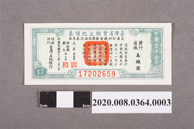 2020.008.0364.0003 臺灣省實物土地債券 甘薯壹千公斤