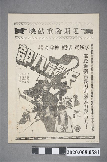 1. 香港電影《傻小子》於臺灣的戲院上映時的電影本事單張。單色雙面印刷。封面印有戲院名「第一劇場」與廣告文字「娛樂之宮 服務第一」、「國片之宮 聲光第一」、「保密防諜,人人有責」,並介紹《傻小子》的故事梗概。本事背面為電影廣告,介紹國語片《天龍八部》。2. 香港電影《傻小子》(香港片名:蔡李佛小子)為長弓電影公司於1976年出品的國語功夫片,張徹導演、張徹與倪匡編劇,謝興、陳信一、甄日良武術指導,傅聲、甄妮、王龍威等領銜主演。長弓電影公司為香港邵氏邵逸夫投資導演張徹自組的公司,張徹將自己的姓氏拆開命名為「長弓」,於1973年率領一批班底到臺灣拍戲,這批「張家班」包含傅聲、戚冠軍、梁家仁、王龍威等後來廣為人知武打明星。《傻小子》男主角傅聲於1971年被張徹挖掘,1973年因主演長弓電影公司出品的《方世玉與洪熙官》廣受關注,成為1970年代1970年代當紅武打明星,1983年因車禍過世。