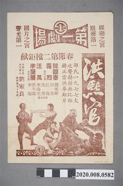 1. 香港電影《白玉老虎》於臺灣的戲院上映時的電影本事單張。單色雙面印刷。封面印有「恭賀春釐」、「第一劇場全體同仁鞠躬」、「保密防諜 人人有責」,並介紹《白玉老虎》的故事梗概。本事背面為電影廣告,介紹國語片《洪熙宮》。2. 香港電影《白玉老虎》為邵氏兄弟(香港)有限公司於1977年出品的國語武俠片,楚原導演、古龍與楚原編劇,唐佳、 黃培基武術指導,狄龍、蕭瑤、施思等領銜主演。楚原本名張寶堅,為著名粵語片演員張活游之子,1956年進入電影圈,1960年代粵語片式微後,先後於國泰機構和邵氏公司擔任導演,1970年代憑《流星.蝴蝶.劍》(1976)、《三少爺的劍》(1977)等片掀起改編古龍武俠小說的潮流。楚原一生執導逾百部影片,包括文藝、喜劇、武俠、懸疑等不同類型,被譽為香港武俠片開山鼻祖之一。