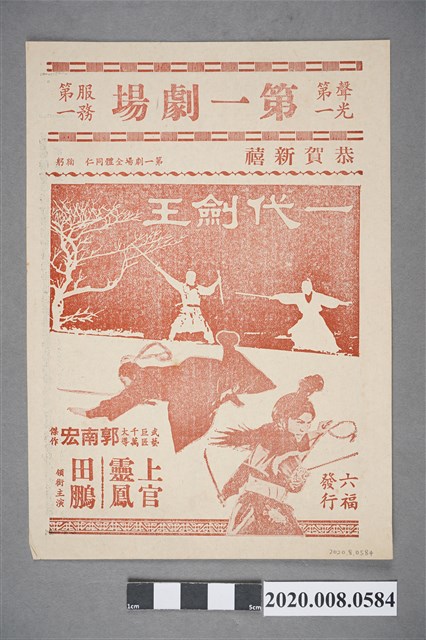 1. 香港電影《明月刀雪夜殲仇》於臺灣的戲院上映時的電影本事單張。單色雙面印刷。封面印有「今日隆重獻映」、「請照通知日期在家接受戶口校正」字樣,並介紹《明月刀雪夜殲仇》的故事梗概。本事背面為電影廣告,介紹國語片《一代劍王》。2. 香港電影《明月刀雪夜殲仇》為邵氏兄弟(香港)有限公司於1977年出品的國語武俠片,楚原導演、秦雨 (即楚原)編劇,唐佳、 黃培基武術指導,狄龍、劉永、施思等領銜主演。本片改編自古龍原著小說《邊城浪子》,為古龍「邊城浪子三部曲」之一(即小李飛刀系列之二)。《明月刀雪夜殲仇》為1977年十大賣座武俠片之一。本片主演之一的狄龍自1976年起,便開始與導演楚原的合作,出演多部由古龍武俠小說改編的電影,是主演楚原執導電影最多的男明星。狄龍、古龍與楚原,更被視為1970-1980年代武俠電影的「金三角」,片片大賣。