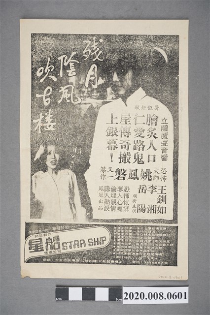 1. 香港電影《破戒》於臺灣的戲院上映時的電影本事單張。單色雙面印刷。封面印有戲院名「國聲 ROYAL THEATER」與廣告文字「第一流影片」、「第一流聲光」、「第一流設備」、「第一流戲院」、「保密防諜,人人有責」,並介紹《破戒》的故事梗概,以及「麗聲觀光大歌廳」的廣告。本事背面為電影廣告,介國語片《殘月陰風吹古樓》,標明「立體魔聲音響」、「恐怖大+W48師姚鳳磐 又一傑作」等廣告文字,以及「華聲餐廳」的廣告。2. 香港電影《破戒》為嘉禾電影(香港)有限公司於1977年出品的國語功夫片,鄭昌和導演、石剛編劇,袁和平武術指導,茅瑛、梁小龍、陳惠敏等領銜主演。鄭昌和為韓國電影導演、編劇,1960至1970年代活躍於香港電影圈,先是在邵氏工作,後轉加盟嘉禾電影公司。在嘉禾期間,他執導了《黑夜怪客》、《艷窟神探》、《黃飛鴻與少林拳》、《鬼計雙雄》、《破戒》等多部影片。