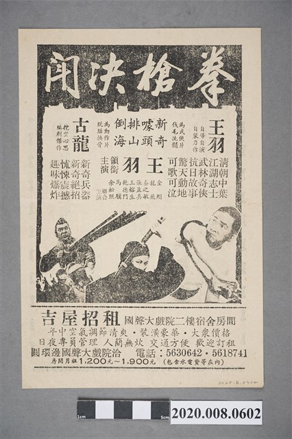 1. 臺灣電影《鷹爪與螳螂》於臺灣的戲院上映時的電影本事單張。單色雙面印刷。封面印有戲院名「國聲 ROYAL THEATER」與廣告文字「第一流影片」、「第一流聲光」、「第一流設備」、「第一流戲院」、「請照通知日期在家接受戶口校正」,並介紹《鷹爪與螳螂》的故事梗概。本事背面為電影廣告,介國語片《拳槍決鬥》,標明「王羽 自導自演 自製力作」、「古龍 挖空心思 編劇傑作」等廣告文字,以及「國聲大戲院二樓宿舍房間招租」的廣告。2. 臺灣電影《鷹爪與螳螂》為永泰影業公司於1977年出品的國語功夫片,李作楠導演、金銘武術指導,張信義編劇,戚冠軍、王道、張翼等領銜主演。李作楠為臺灣著名動作片導演,曾擔任知名導演丁善璽的副導長達5年,1970年代中後期漸轉赴香港發展,代表作包含動作片《南拳北腿活閻王》(1976)、《撈家撈女撈上撈》(1978)、《南北腿王》(1980)、《少林鬪喇嘛》(1983)等片。