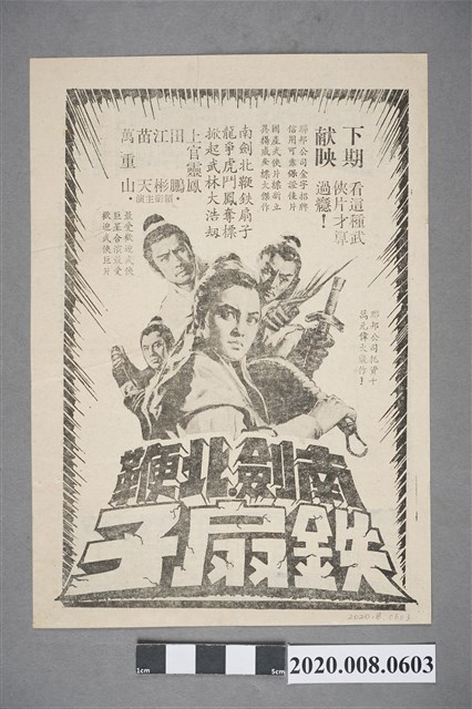 1. 香港電影《寒山怒吼太陽愁》於臺灣的戲院上映時的電影本事單張。單色雙面印刷。封面印有戲院名「國聲 ROYAL THEATER」與廣告文字「第一流影片」、「第一流聲光」、「第一流設備」、「第一流戲院」、「保密防諜,人人有責」,並介紹《寒山怒吼太陽愁》的故事梗概,以及「華聲餐廳」的廣告。本事背面為下期電影廣告,介國語片《南劍北鞭鐵扇子》,標明「聯邦公司金字招牌 信用可靠保證佳片」、「國產武俠片標新王 異揚威奪標大傑作」等廣告文字。2. 香港電影《寒山怒吼太陽愁》為香港譚氏影業公司於1977年出品的國語功夫片,林白導演、潘榕民編劇,黃國柱、潘章明武術指導,茅瑛、譚道良、龍君兒等領銜主演。「譚氏影業公司」為香港藝人譚炳文於1970年代創立,譚炳文同時具有播音員、配音員、歌手、演員和導演的多重身分,從事配音與教學長達半世紀,有「配音教父」及「配音王」之美譽。此外,他更是香港首位賽馬評述員。