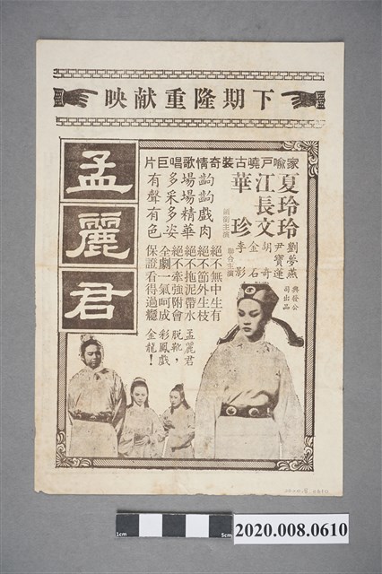 1. 電影《鶴形伏虎鬥蛟龍》於臺灣國聲大戲院上映時的電影本事單張。黑白印刷的本事正面印有該片的故事簡介,以及「國聲 Royal Theater」商標和「第一流聲光 第一流影片」、「第一流戲院 第一流設備」、「保密防諜,人人有責!」等字樣。本事背面則為下期隆重獻映,導演的臺灣電影《孟麗君》之電影廣告,其上註記有「家喻戶曉古裝奇情歌唱巨片」、「絕不無中生有 絕不節外生枝 絕不拖泥帶水 決不牽強復會 全劇一氣呵成 保證看得過癮」、「孟麗君脫靴,彩鳳戲金龍」等廣告文案,以及夏玲玲、江長文、華珍等主演演員名單。2. 《鶴形伏虎鬥蛟龍》為1977年興南影業社出品的臺灣動作電影,又名《五形八拳》,該片乃由宋廷美導演,武術顧問為蔡神助,龍飛、小寶武術指導,羅烈、司馬龍、夏玲玲等主演。興南影業社為活躍於1960至1970年代的臺灣電影公司,曾出品《武當小劍客》(1962)、《海女紅短褲》(1977)、《鶴形伏虎鬥蛟龍》等以台語片為主的十餘部電影。宋廷美為出生於1944年的香港演員、編劇與導演,導演過《鶴形伏虎鬥蛟龍》、《擂台》(1972)、《紅衣喇嘛》(1979)等七部電影。
