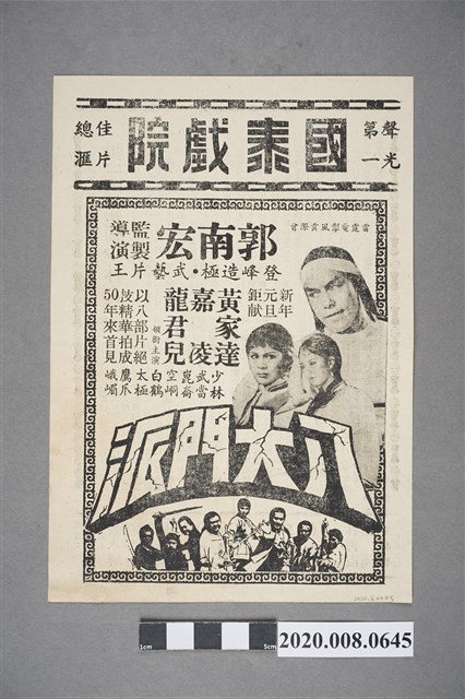 1. 臺灣電影《張三豐獨闖少林》於臺灣的國泰戲院上映時的黑白電影本事單張。封面上有「張三豐獨闖少林 本事」及介紹電影故事梗概,右上處標明「請照通知日期,在家接受戶口校正。」,版面下方為影片廣告,介紹《我是一片雲》,標明「春節第一砲巨獻」、「原著:瓊瑤」等廣告文字,並列出主演演員名單。本事單張背面版頭標明「國泰戲院」、「聲光第一」、「佳片總匯」廣告文字,內容為影片廣告,介紹《八大門派》,標明「郭南宏監製導演」、「以八部片絕技精華拍成50年來首見」、「少林武當崑崙崆峒白鶴太極應爪峨眉」等廣告文字,並列出主演演員名單。2. 臺灣電影《張三豐獨闖少林》為1976年由巫氏影業有限公司出品的古裝功夫電影,由巫敏雄導演、鄒亞子編劇,蘇國樑武術指導,上官靈鳳、石峰、王冠雄等人主演。巫敏雄為臺灣電影導演、演員,1970年代開始導演功夫動作片,同時擔任動作指導,導演代表作品:《黑山大俠》、《大忠烈》(1976)、《烈日狂風》(1973)等片。