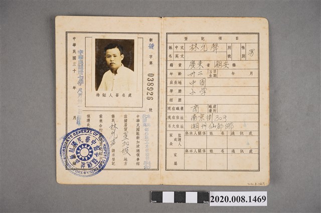 「中華民國僑民登記證」, 民國37年駐新加坡總領事館簽發, 貼有照片, 另附1949年1月汕頭海港檢疫所「港埠檢疫」種痘證書, 貼有照片, 為同一人持有, 以上2冊均為完整