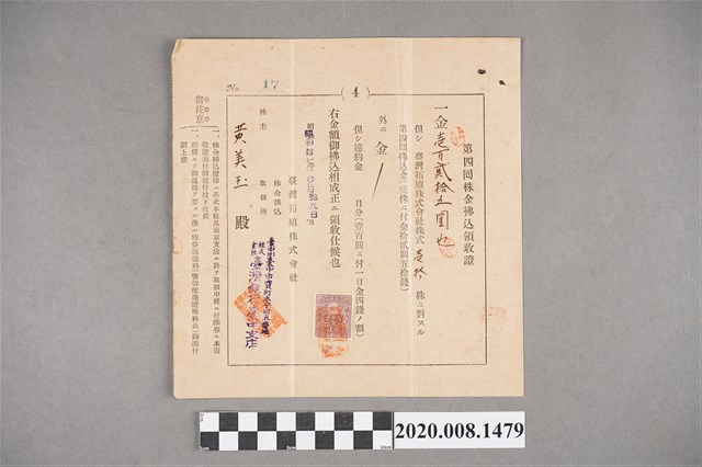 2020.008.1479 臺灣拓殖株式會社第四回株金拂込領收證