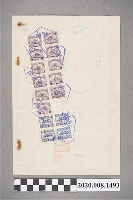 民國30年土地權狀5張, 另倉單2張, 計7張, 分貼國父像、赤崁樓、博物館…等印花