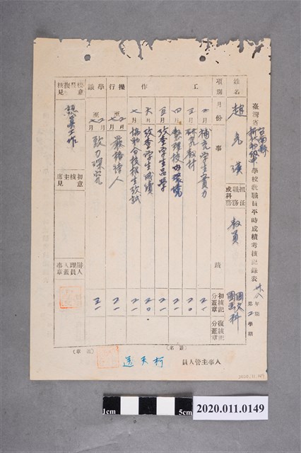 本件為臺南縣立新化初級中學教職員平時成績考核記錄表,被登記者為國文科及圖畫科教師趙光漢,文件由臺南新化柯瑞吉家族捐贈,為捐贈人之父親柯天送先生(1900-1973)於1947-1965年間任職於新化初中時所留下之文件。根據表單上字樣,登記時間為卅八學年第一學期(按:時間範圍為1949年8月至1950年1月),評分項目包括「工作」、「操行」、「學事」,並蓋有主管柯天送先生印章。本文件可用以觀察戰後初期教育制度與學校人事管理方式。