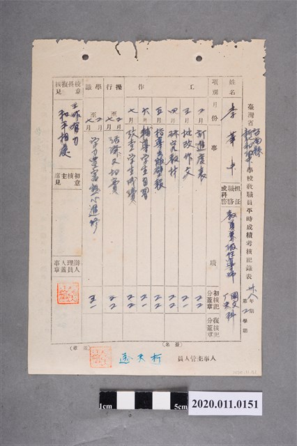 本件為臺南縣立新化初級中學教職員平時成績考核記錄表,被登記者為國文科及歷史科教師李華中,文件由臺南新化柯瑞吉家族捐贈,為捐贈人之父親柯天送先生(1900-1973)於1947-1965年間任職於新化初中時所留下之文件。根據表單上字樣,登記時間為卅八學年第一學期(按:時間範圍為1949年8月至1950年1月),評分項目包括「工作」、「操行」、「學事」,並蓋有主管柯天送先生印章。本文件可用以觀察戰後初期教育制度與學校人事管理方式。