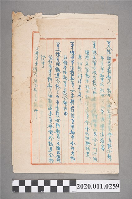 本件為臺灣省中等、國民學校教員甄選辦法抄錄手稿,由臺南新化柯瑞吉家族捐贈,為捐贈人之父親柯天送(1900-1973)先生,於1947至1965年間任職於新化初中時所留下之物件。本件為共包括3張頁面,皆為柯天送先生以藍筆所抄,共計11條規定。1945年11月,臺灣省行政長官公署頒布「臺灣省各級學校及教育機關接收處理暫行辦法」,省教育處組織教師甄選委員會,11月25日公布「臺灣省中等、國民學校教員甄選辦法」,負責中學與國民學校教師之選用事宜。依照甄選辦法之資格限定,審查標準以學經歷審查為主,以彌補戰後初期師