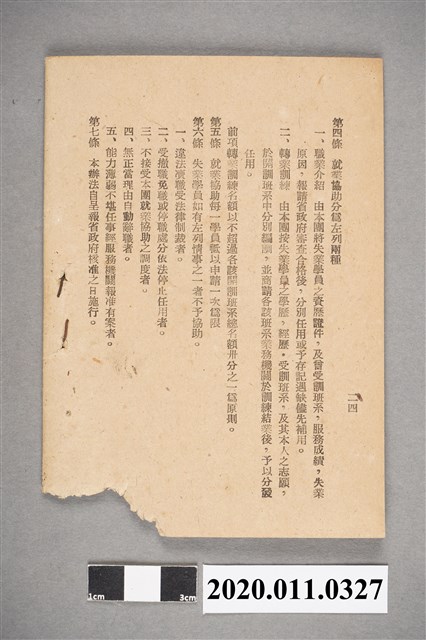 本件為臺灣省訓練團手冊,手冊有蟲蛀情形,由臺南新化柯瑞吉家族捐贈,為捐贈人之父親柯天送(1900-1973)先生,於民國35年(1946)4-5月參加臺灣省地方行政幹部訓練團第二期中等師資班所留下之文件。手冊內容包括:「臺灣省訓練團組織規程」、「游泳池管理規則」、「畢業學員須知」、「畢業學員銓定資格考試辦法」、「畢業學員各縣市聯絡站設置辦法」。