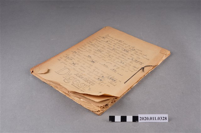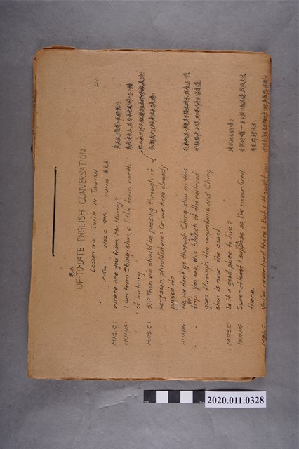 本件為英語會話教材,部分頁面有破損情形,由臺南新化柯瑞吉家族捐贈。文件內容包括會話課(Up-to-date Conversation)、短文閱讀。尾頁印有「Reader Digest」(讀者文摘)、「February」(二月)、「1950」字樣。