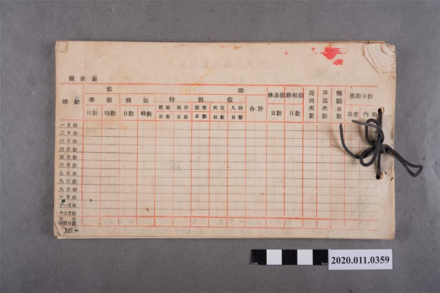 本件為臺南縣立新化初級中學職員差假勤惰記錄卡,由臺南新化柯瑞吉家族捐贈,為捐贈人之父親柯天送先生(1900-1973)於1947至1965年間任職於新化初中時所留下之物件。登錄年度為中華民國41年(1952),登載校長闕鎬曾以及柯天送、廖鑑文、蘇增華、高慰中、李炳南、李華中、胡波平、魏思孝、王家成、辛中正、姜錫齡、白質瑩、蔡萬枝、馮淑明、林寶長、郭英玉、洪進財、楊葉、林芳松、譚英蘊、朱德培、林寶書、丁鏡清、郭元義等教職員、工友等差勤資料。