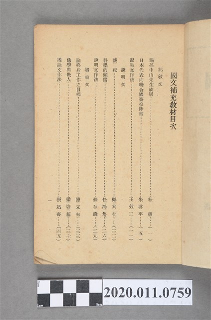 本件為臺灣省訓練團編印《補充教材之一 國語續篇》,由臺南新化柯瑞吉家族捐贈。本書由臺訓出版社印刷,初版時間為民國37年(1948)7月。根據內頁「序言」,此書為1947年國語統一教材的續編,共分為兩冊,本書為第2冊,編輯者為春浩泉、許詮、王炳章、江溯源等人。