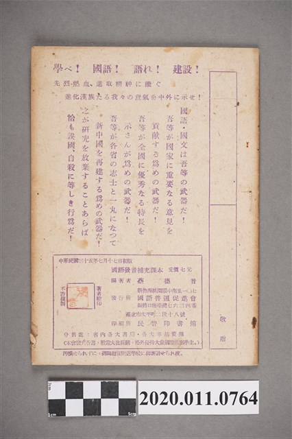 本件為蔡德音編《國語發音教育補充課本》,由國語普遍促進會發行,1946年7月出版,本文件由臺南新化柯瑞吉家族捐贈。扉頁印有聲韻表,課文內容分為三部分,上方為課文以注音符號呈現,左下方為中文課文,右下方為日文課文,主要為協助戰前熟悉日本語的民眾、學子熟悉中文書寫,以及說國語。本件為作者蔡德音,出生於臺南市,青年時期前往廈門求學,返臺後參與文化運動,發表作品於「伍人報」、「先發部隊」等文藝雜誌,並加入古倫美亞唱機唱片公司擔任填詞者,戰後因精通中文,執教於桃園國民學校,另編有「語型語氣文法精解」(1947)。