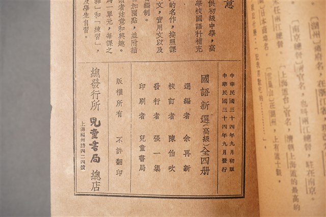本件為余再新編《國語新選》,全書共4冊,本書為第2冊。由臺南新化柯瑞吉家族捐贈,民國34年(1945)9月印刷發行,發行者為上海兒童書局。