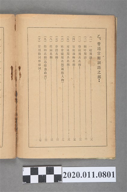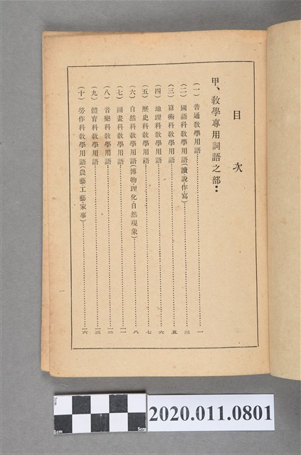 本件為臺灣省行政長官公署教育處編輯《國民學校常用教學詞語》,由臺灣書店印行,1947年4月初版,屬「國民教育輔導叢書」之一,本件由臺南新化柯瑞吉家族捐贈,封面蓋有柯瑞吉父親柯天送之私章。內容分為:(一)教學用語,如:普通教學用語、國語科教學用語、算術科教學用語、地理科教學用語、歷史科教學用語、自然科教學用語、圖畫科教學用語、音樂科教學用語、體育科教學用語、勞作科教學用語。以及(二)普通常用詞語:一般用語、稱呼用語、學校用具、家庭器物、交通用具、社會環境、身體、疾病、動物、形容詞等。