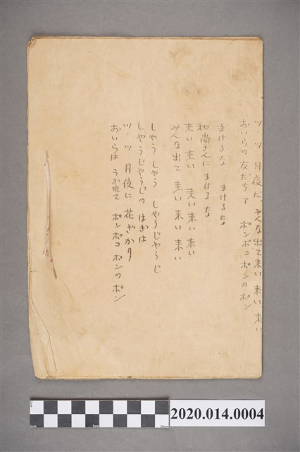 本件第1頁開頭可見印有標題「狸囃子(タヌキハヤシ)」,按「狸囃子」為日本傳統民間怪談故事;而文章內容主要條列「甲」、「乙」、「和」、「小」等角色的對談臺詞,據此推測,本件有可能是教學所用劇本,發給學生持用,藉以由教師進行戲劇活動。在最後第9-10頁,另附有〈證城寺の狸囃子〉的童謠歌詞。
