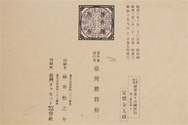本件為騎馬釘之小冊,紙本,封面題名「公學校用硬筆書キ方練習帖(第三學年用下)」,著作兼發行者為臺灣總督府,印刷者為藤井松之介(臺北市宮前町363番地),印刷所為臺灣オフセット印刷株式會社(臺北市宮前町363番地),昭和6年(1931)3月28日第1版印刷,3月31日第1版發行,本件為昭和10年(1935)9月10日第5版發行。當時定價金5錢。