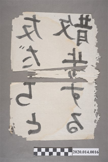 本件為書法作品,紙張左側有破碎,已分裂為上下兩件,右下角亦有些微破碎。此為日治時期臺北市士林公學校學生書法作品,共有八字「友だちと散步する」(跟朋友散步),為直式書寫、由右而左,以白色紙質為底、黑色墨汁為字。