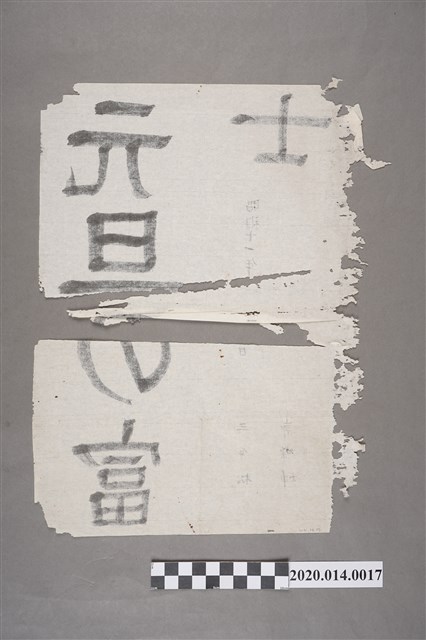 本件為書法作品,紙張左側有破碎,已分裂為上下兩件,右下角亦有些微破碎。此為日治時期臺北市士林公學校學生書法作品,共有五字「元旦の富士」(元旦的富士山),為直式書寫、由右而左,以白色紙質為底、黑色墨汁為字。左下寫有日期為昭和11年,月份日期不明。