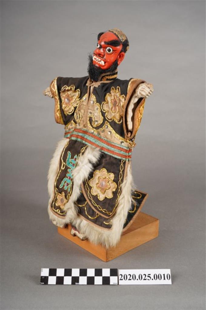 1.本文物為傳統布袋偶中的「紅大北」。頭部及手腳為木製,內體為織品製。頭部色漆尚稱完整,無盔帽,粗眉、落腮鬍;雙手皆為武手作握拳狀,中空的掌心可插入武器或道具。身著黑底彩繡改良甲,腳部穿著黑色高靴。整尊戲偶固定於一12cm*12cm的木塊上。2.戲偶的雕製程序依序為:雕刻粗胚、磨光、糊棉紙、打土底、粉底、開眉、打花面、裝髮鬚,此外,尚有活眼或活嘴的製作。3.北仔,屬於淨角(花臉)的一種,分為金、銀、紅、白、黑、青、黃七類,金為財神的化身,餘者大多為善於巴結權貴的角色或綠林人物。紅大北,通常扮演番邦將軍等角色。