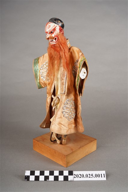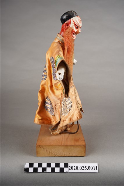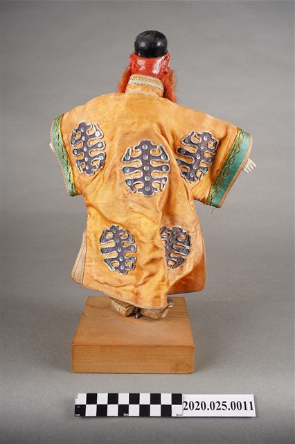 1.本文物為傳統布袋偶中的「白大花」。頭部及手腳為木製,內體為織品製。頭部色漆尚稱完整,無盔帽,蓄橘色落腮長鬚。雙手皆為武手作握拳狀,中空的掌心可插入武器或道具。身著橘色服裝,形制類似老旦帔,腳部穿著黑色高靴,左靴上貼著一張寫著「28」的標籤紙。整尊戲偶固定於一12cm*12cm的木塊上。2.戲偶的雕製程序依序為:雕刻粗胚、磨光、糊棉紙、打土底、粉底、開眉、打花面、裝髮鬚,此外,尚有活眼或活嘴的製作。3.白大花,屬於淨角(花臉)的一種,多飾演奸邪的角色。
