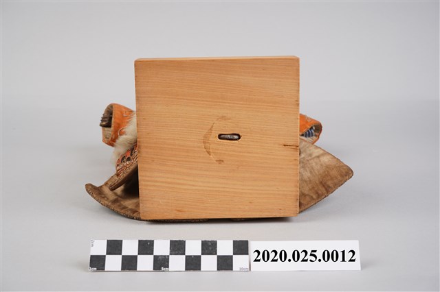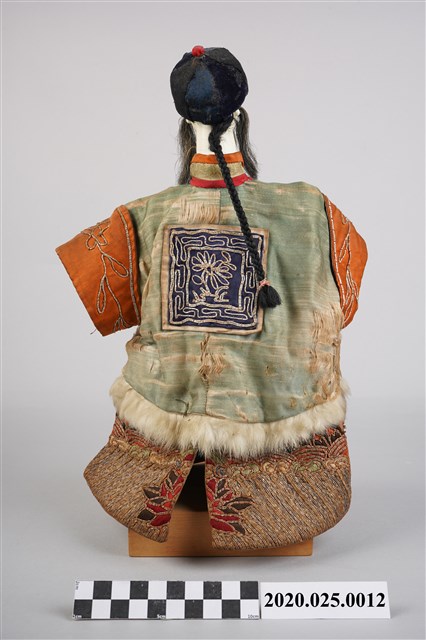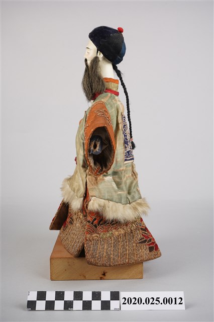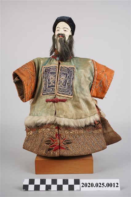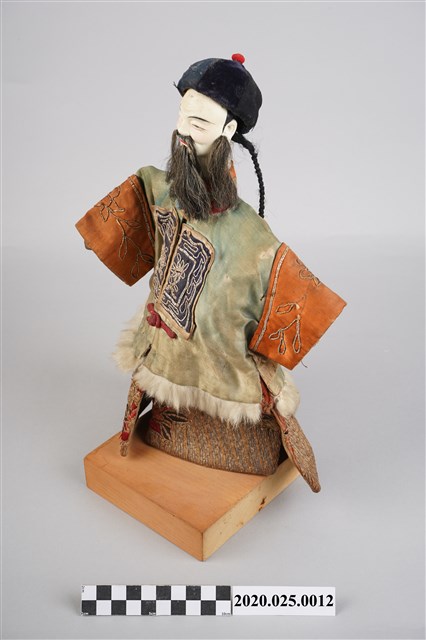 1.本文物為傳統布袋偶中的「鬚文」。頭部及手腳為木製,內體為織品製。頭部色漆尚稱完整,清朝半頭辮子髮型,戴黑色瓜皮帽。嘴唇上、下頦、兩頰皆蓄有灰鬚。雙手皆為武手作握拳狀,中空的掌心可插入武器或道具。身著草綠色馬褂袍,藍色補子、橘色袖口,下襬內裡以原子筆寫「清朝乾隆君」五字,腳部穿著黑色高靴。整尊戲偶固定於一12cm*12cm的木塊上。2.戲偶的雕製程序依序為:雕刻粗胚、磨光、糊棉紙、打土底、粉底、開眉、打花面、裝髮鬚,此外,尚有活眼或活嘴的製作。3.鬚文,屬於生角的一種,又稱「秋文」,泛指中年以上之男子,常表現出溫文儒雅的模樣。