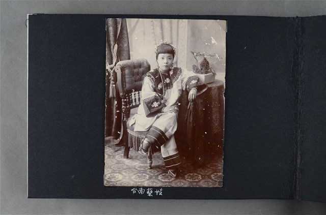 玻璃底片用蛋清作原料所洗出的相片一冊,內有安平港晚渡、安平英國領事館、鳳山城外水牛及車、臺南藝伎、臺南開山神社、鄭成功像、臺南守備騎兵隊、臺灣榕樹、臺南竹仔街等27張相片。