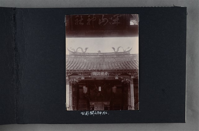 玻璃底片用蛋清作原料所洗出的相片一冊,內有安平港晚渡、安平英國領事館、鳳山城外水牛及車、臺南藝伎、臺南開山神社、鄭成功像、臺南守備騎兵隊、臺灣榕樹、臺南竹仔街等27張相片。