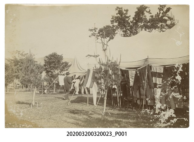 玻璃底片用蛋清作原料所洗出的相片一冊,內有安平港晚渡、安平英國領事館、鳳山城外水牛及車、臺南藝伎、臺南開山神社、鄭成功像、臺南守備騎兵隊、臺灣榕樹、臺南竹仔街等27張相片。